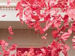 L’artiste joue entre l’intérieur et l’extérieur du Pavillon canadien coincé entre des puissances dominantes (GB, Allemagne, France) et de taille modeste par rapport à ses voisins. Avec comme titre Trinket qui désigne des bibelots, des colifichets, l’artiste renvoie au passé commercial de la Sérénissime basé sur la traite et le commerce international. Les millions de petites perles de verre fabriquées sur l’île de Murano servaient de monnaie d’échange. Elles ornent un rideau tout autour du bâtiment alors qu’un dégradé de couleurs renforce la notion esthétisante jouant sur les codes de l’abstraction. On connait l’habilité de l’artiste pour ses propositions à partir de l’in situ qui font ressurgir d’autres histoires comme au CAPC de Bordeaux renvoyé à son passé esclavagiste de manière subtile et dérobée.