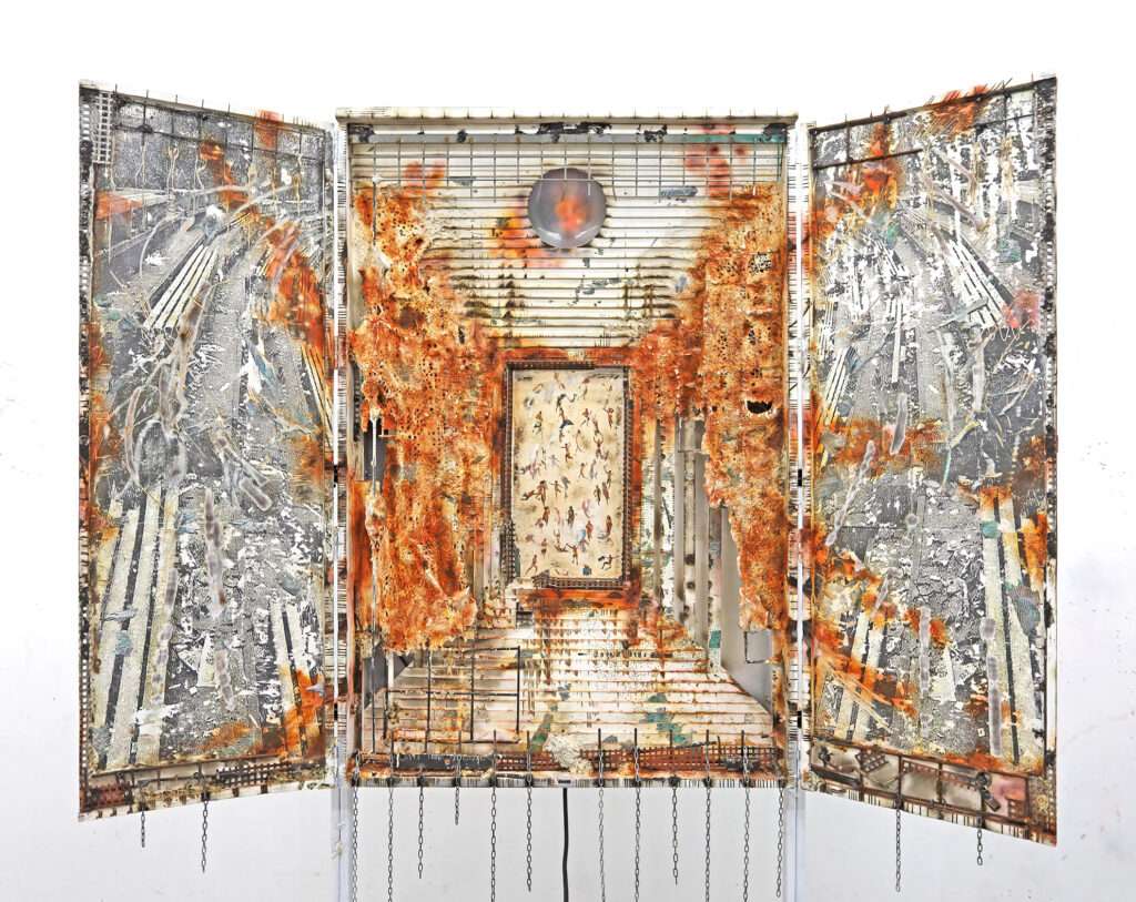 Media player, SD card, amplifier, 4 speakers, LED screen, video loop, acrylic lens, wood, steel, aluminium, medical tape, smoke grenade, jesmonite, paper, image transfer, UV varnish.