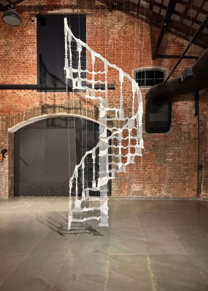 Sumakshi Singh, UNTITLED (STAIRCASE), 2024 Thread & Lace Drawing ( Installation) courtesy the artist, 193 Gallery