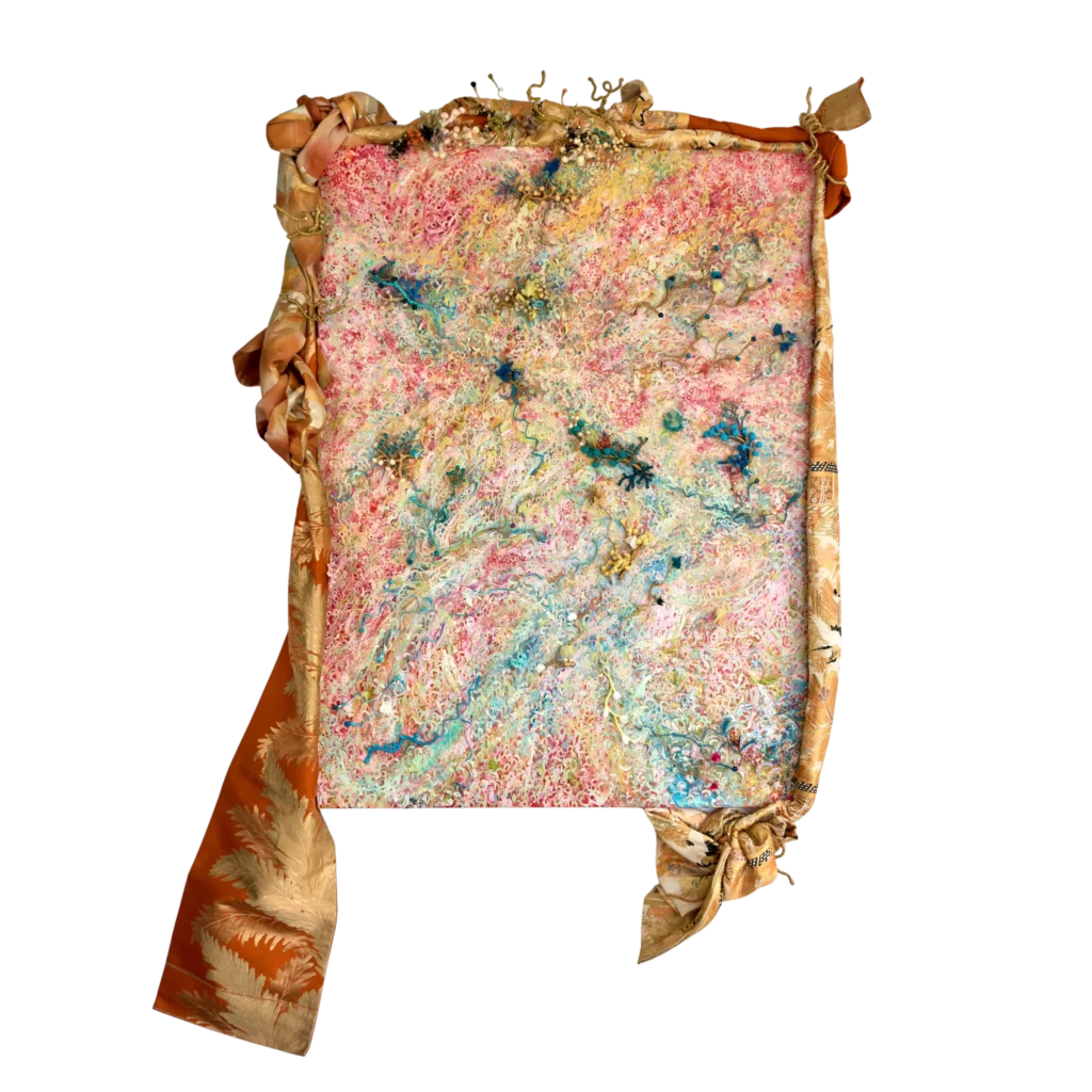 À l’occasion de Asia Now, Tango dévoile Healing Code, un ensemble d’œuvres interconnectées. Healing Poemrassemble des créations textiles aux allures calligraphiques, tandis que Heart Bridge propose des peintures et des installations murales intégrant des éléments sculpturaux réalisés à partir de tissus de kimonos et d’obis. En réutilisant ces matériaux sous forme organique, l’artiste interroge la manière dont le tangible et l’intangible peuvent être renouvelés et réinventés.