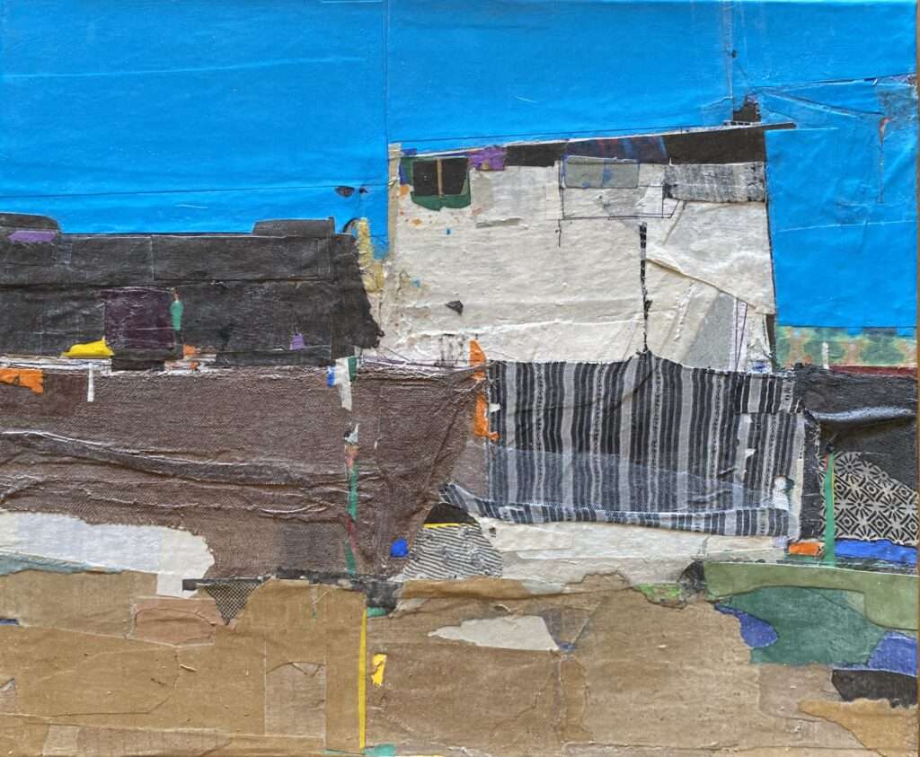 Mohammed Joha, Houseless No. 1, 2025, textile et technique mixte de collage sur toile, 46×55 cm Courtesy de l’artiste, Zawyeb Gallery