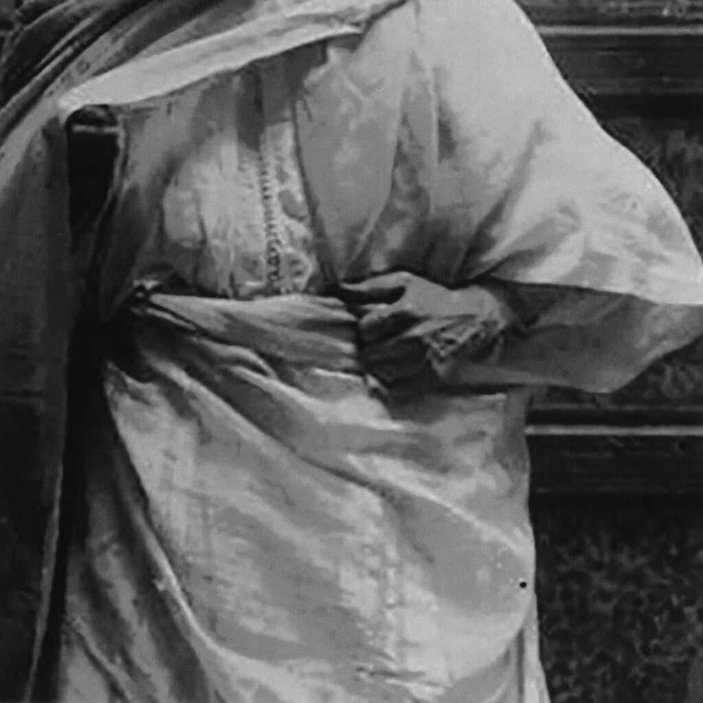 Femme voilée intégralement, elle se penche pour saisir une théière ; photographie prise devant une tenture, 1918-1919 : date de prise de vue. © musée du quai Branly – Jacques ChiracClérambault, Gaëtan Gatian de © musée du quai Branly – Jacques Chirac