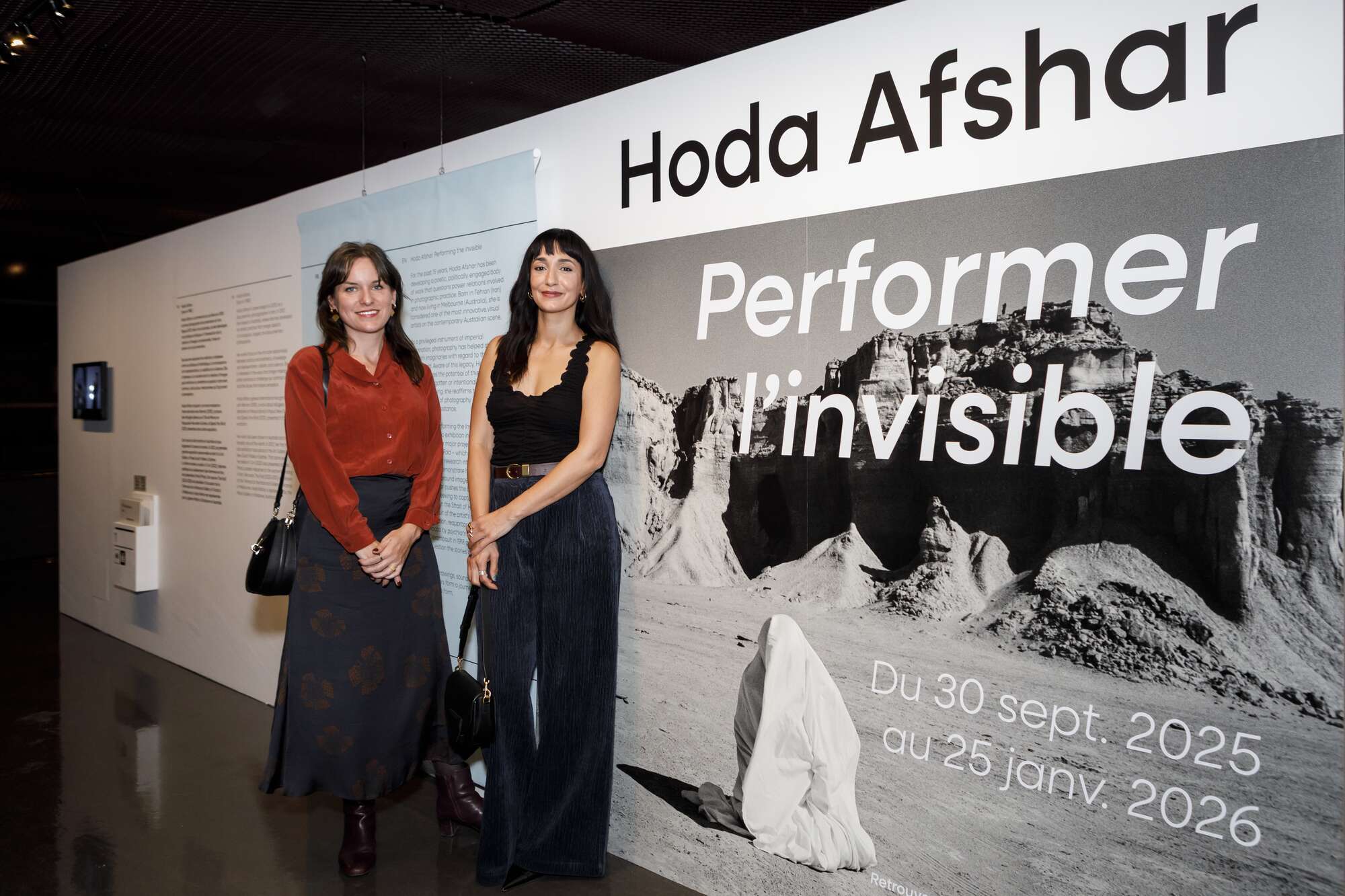 Annabelle Lacour et Hoda Afshar (de gauche à droite) Exposition « Hoda Afshar. Performer l’invisible » proposée au musée du 30 septembre 2025 au 25 janvier 2026.© musée du quai Branly -Jacques Chirac, photo Mehrak Habibi