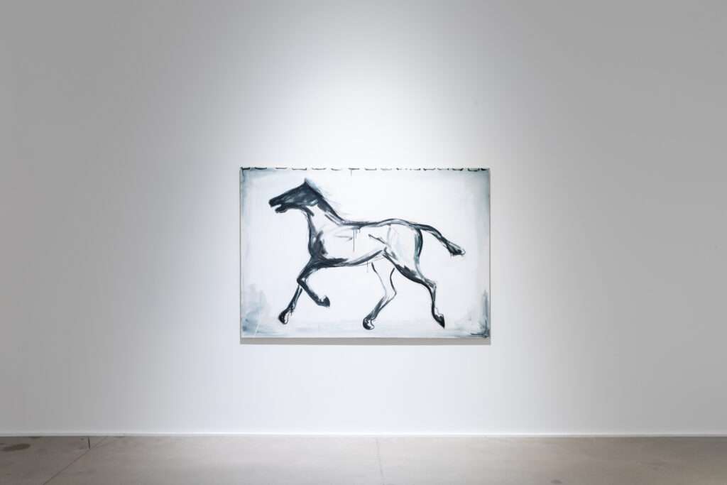 The work is closely linked to cinema, a theme that is very important to me. When we think about history, we often think in terms of film images rather than museum displays. For instance, when we imagine the Romans, we picture Gladiator or Ben-Hur, not artifacts in a museum. Movies profoundly shape the way we perceive the past. This led me to return to some of the earliest cinematic images, such as Muybridge’s series of horse photographs. For my exhibition at the gallery, the large paintings were arranged in a big circle, so that as a viewer, you become part of the film itself.