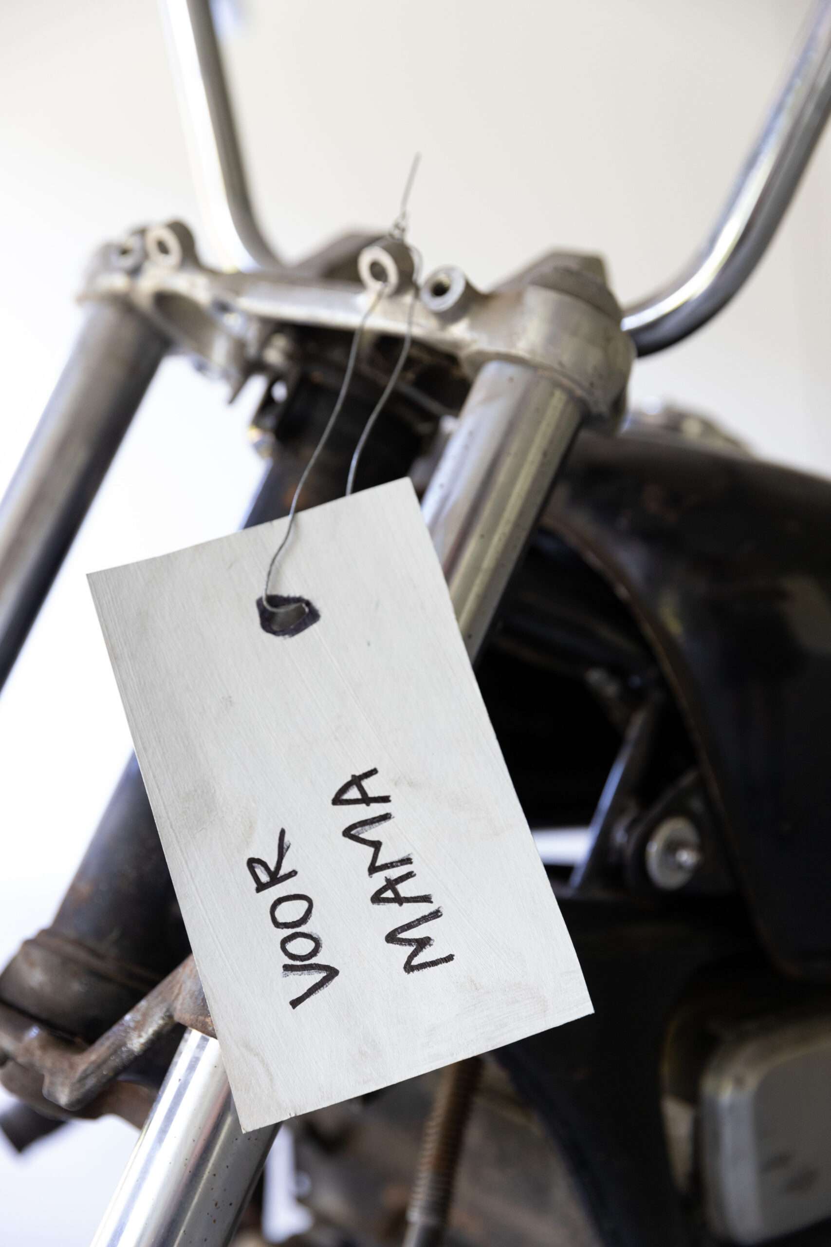The bike is titled Before I Turned 50, accompanied by a small note dedicated to my mother. It reflects on the idea of a midlife crisis and the broader social injunctions about achieving something “meaningful” before a certain age. All these pressures weigh heavily on one’s shoulders, symbolised by the large chain and its burden. It stands as an invitation to resist society’s prescribed rules.