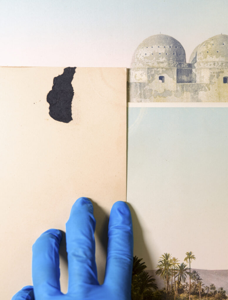 Gloria Oyarzabal a produit pour l’occasion deux séries « Essay for an Atlas of the Ethical Journey of Aesthetics. The Devil is in the Details » et « ON PHANTOMS, Wounds & the Wa/ondering Eye » où à partir de collages entre les cartes postales apposées à des images actuelles, elle souligne les cicatrices, traces, béances de l’histoire. Un contrepoint d’une grande justesse face à cet alignement impeccable en noir et blanc, selon les typologies de l’époque, « scènes de genre » « paysages » et héritées de la peinture.