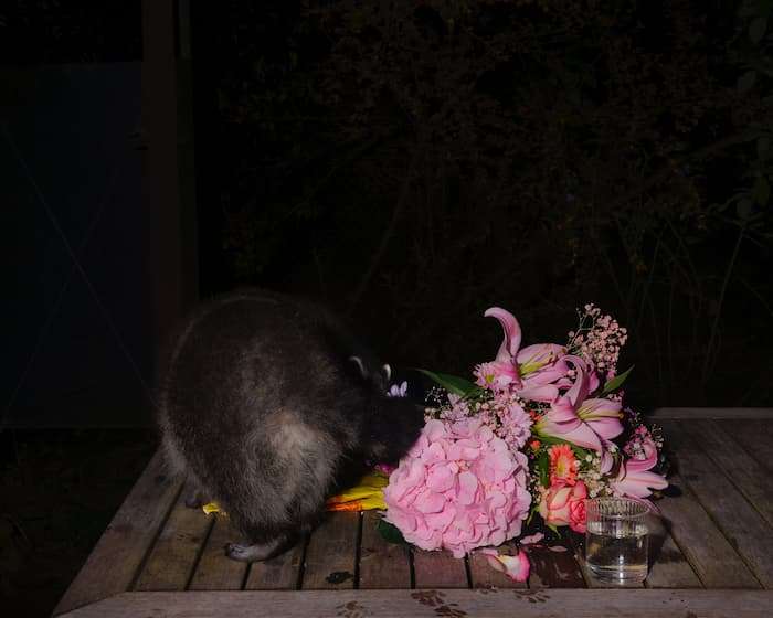 Une scène qu’elle recréé ensuite après des repas en famille ou entre amis, composant une forme de nature morte à partir des restes : repas, des fleurs, miettes et laissant sa caméra se déclencher en son absence. Des moments suspendus qui mettent en lumière une coexistence entre l’humain et l’animal souvent invisible.