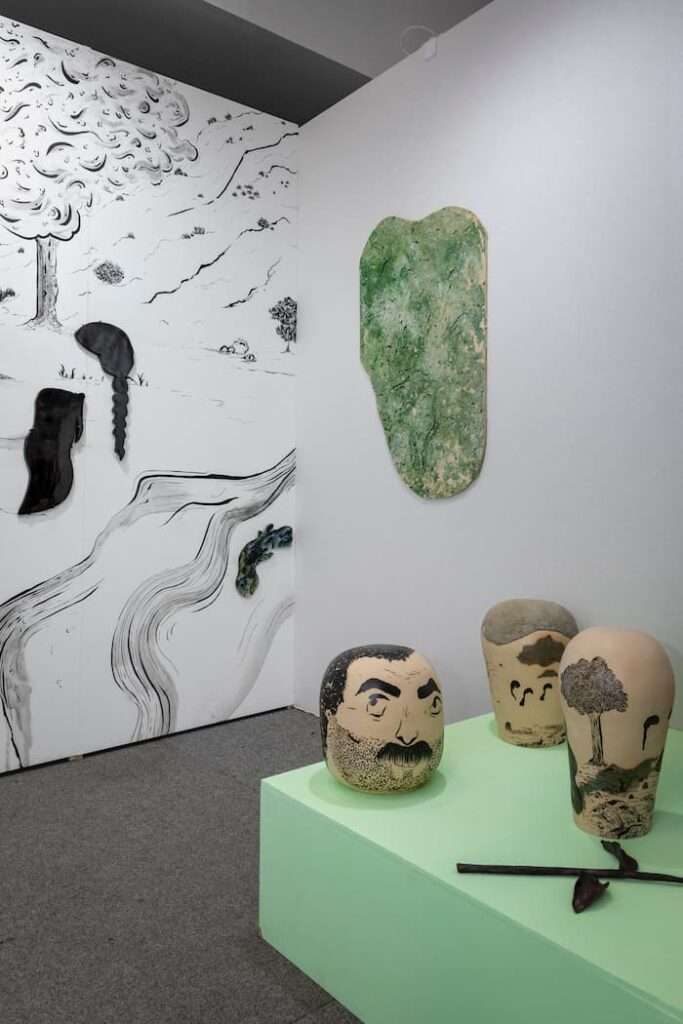 Alicia Fahmy et Ludmilla Malinovsky ont créé leur galerie en 2023 au 44 rue Sévigné dans le Marais après une période d’itinérance. Elles participent pour la première fois à Drawing Now -secteur Inception- avec un solo show très remarqué de l’artiste Bahar Kocabey conçu comme un diorama en hommage aux combattantes kurdes. Diplômée des Beaux-arts de Paris, l’artiste interroge les métamorphoses de la lutte qui se prolongent dans les sphères domestiques et quotidiennes autour de gestes et de pratiques traditionnels. La résilience, le soin, la féminité, les légendes orales des résistances et résistants kurdes irriguent ces paysages dont le statut demeure indéterminé. Des présences indicielles dont le regardeur peut sonder les multiples strates. Dessins muraux, fresques, céramiques, tout l’espace est transformé en vaste chambre d’écho. Ludmilla Malinovsky revient sur cette décision de participer à Drawing Now autour de l’univers de Bahar Kocabey et sa vision élargie du médium, le politique se mêlant au sensoriel. Les récits empêchés et identités fragmentées font partie des lignes de force de la galerie entre globalisation et ancrages culturels. Elle a répondu à mes questions.