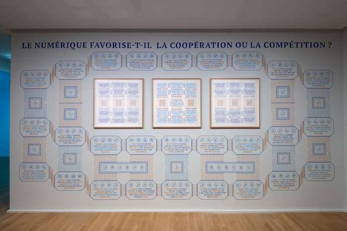 Dans la dernière partie HOLO du grec signifiant « le tout », l’on assiste à la prolifération d’internet dans nos environnements et architectures, faisant du monde en gigantesque réseau aux multiples ramifications. La donnée, ce graal, ce nouvel or noir, se matérialise chez plusieurs artistes. Juliette Green a réalisé une commande spéciale à cette occasion à partir de ces diagrammes que l’on connait. Elle a posé la simple question à plusieurs internautes : « le numérique favorise-t-il la coopération ou la compétition ? » et leurs réponses révèlent certaines ambiguïtés entre logiques compétitives ou initiatives solidaires.