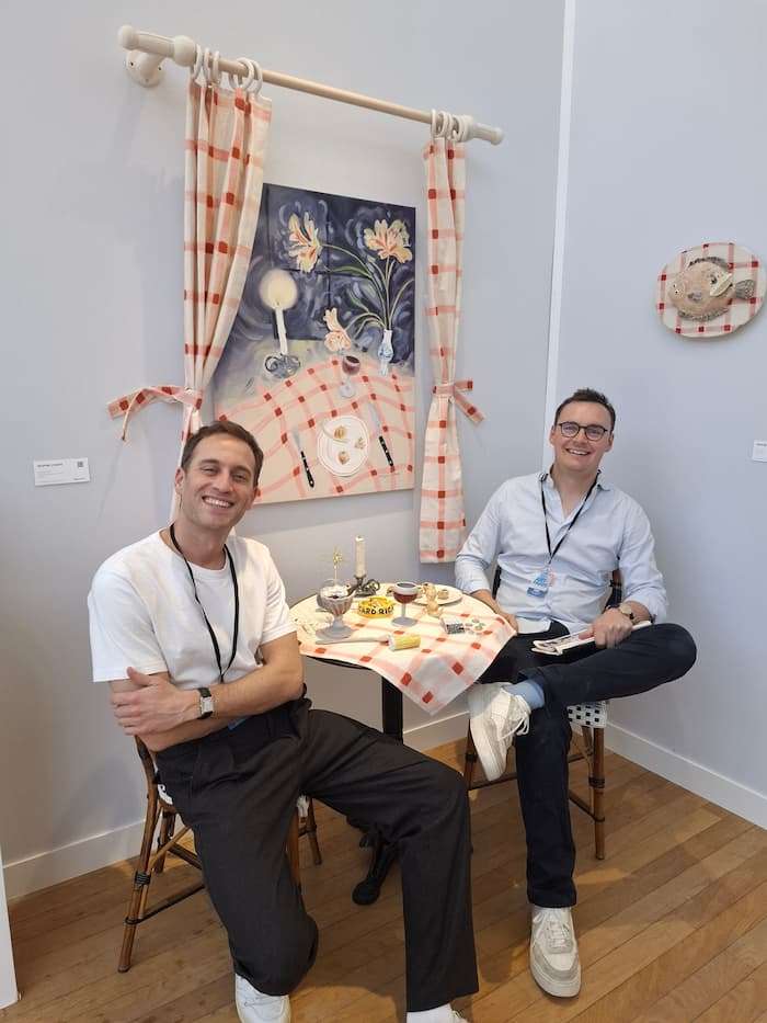 En 2022 le couple Edward van Houtte et Ranji Safarian fondeEdji Gallery à Bruxelles après plusieurs expériences nomades. Ils revendiquent une approche inclusive autour d’une scène ultracontemporaine. Pour leur retour à Art Paris dans le secteur Promesses, Philippine d’Otreppe part de son observation de scènes quotidiennes transposées à l’imaginaire parisien, façon ambiance Amélie Poulain à travers l’évocation de plusieurs tables dressées avec nappes à carreaux et tous les stéréotypes associés à Paris : la baguette, le cendrier Ricard, le pâté en croute, la bouteille de rouge… Que ce soit la céramique ou la peinture, le motif du déjeuner sur l’herbe est un classique des Impressionnistes. L’occasion de rencontrer Ranji et d’en savoir plus sur ce qui les anime. Il nous dévoile également quelle va être leur proposition pour Art Brussels.