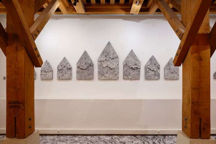 Un autre point déterminant réside dans le passage de l’informe du sol — avec la grande céramique imprégnée de l’expérience magmatique de l’Islande, qui semble s’amplifier dans les flux tourbillonnaires du dessin d’un schiste très friable trouvée lors d’une résidence en Suisse — vers une élévation murale qui cherche sa forme, sa régularité, sa composition. Cette matière fluide et ondoyante s’élève en effet sur les murs en des feuillets géométriques qui semblent en contenir les poussées, les craquelures, les mouvements, et transcrire l’expression interne de la matière, entre vitalité et fragilité. À gauche, ce que l’on appréhende comme des formes de maisons ou de montagnes, désignent d’abord (telles des flèches) une dynamique d’élévation, malgré ou à partir d’une matière impactée et stratifiée, qui se délite et se recompose, comme porteuse d’une longue historicité. À droite, des rectangles crénelés instaurent un rythme qui rappelle celui des piliers mais aussi celui d’une écriture (évocation que portent aussi dans leurs trames « en bâtons » les Fêlures du mur opposé) : une écriture qui ne donne à lire que son rythme, qui relève plutôt d’un processus, d’une recherche à inscrire ce qui échappe. Ces crans découpés suggèrent une sorte de syntaxe — deux, trois, quatre éléments… —, de jeu infini d’assemblages, mais aussi une incomplétude, comme des fragments en attente. Si leur texture évoque la cassure, elle vient aussi d’un regard porté sur des fortifications (celles du château d’Amboise) à une très grande échelle temporelle : ces architectures fortes furent bâties à partir de pierres sédimentaires (comme le tuffeau ou la craie), formées à partir de bris de coquillages. La fragmentation — graphique dans les textures, à l’intérieur d’une série d’œuvres, mais aussi l’échelle de l’exposition — produit une autre forme d’immersion, fondée sur l’alternance, la scansion, le battement, la respiration entre pleins et vides, comme si chaque pièce, par ponctuation, participait d’une grande écriture murale, qui venait énoncer une élaboration humaine, un travail de transcription à partir d’un sol qui nous déborde et qui suggère le dessous, comme sismique ou magmatique, ou encore matière inconsciente ou originaire.