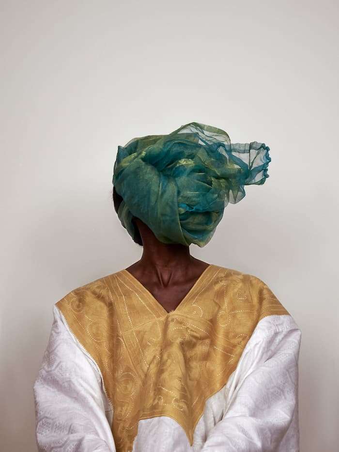 Souleymane Bachir Diaw, Grand boubou blanc avec broderies dorées et foulard vert, zone grise, 2021, série Sutura, 2021-en cours