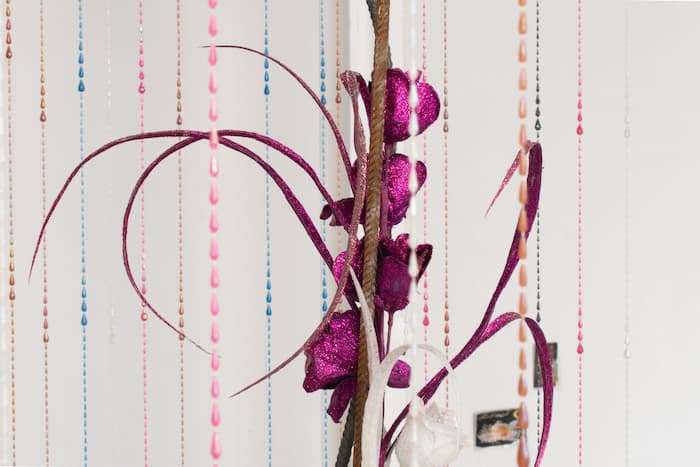 Dans cette continuité, j’ai cherché à matérialiser cet espace sous la forme d’un claustra, à la fois structure protectrice et dispositif de mise à distance. L’installation prend l’allure d’une cage ou d’un seuil, traversée par un rideau de perles évoquant des gouttes, des larmes en suspension, auquel se mêlent des moulages de figuier de Barbarie. En son centre, une structure florale convoque à la fois les codes de la décoration intérieure et l’imaginaire du jardin, dans une tension entre intérieur et extérieur.