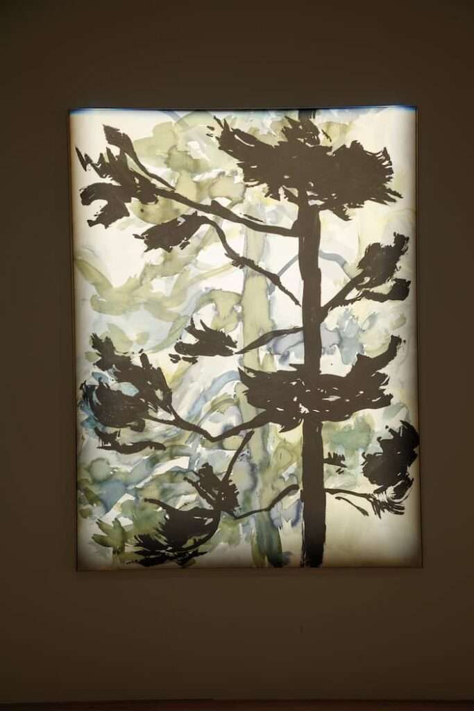 À la sortie de l’école, j’ai été engagée par Richard Peduzzi au théâtre des Amandiers, dans l’équipe qui réalisait les décors. Nous avons travaillé notamment pour le musée d’Orsay, puis avec Patrice Chéreau, réalisant décors peints et affiches. Cette expérience m’a appris à penser en termes de circulation, de rythme et de présence. Plus que la scénographie au sens strict, elle a nourri mon rapport à la composition, aux modes de représentation, à la distance du sujet, à la question des plans. À Chaumont, j’ai conçu l’exposition comme un espace mental, sans hiérarchie, où les œuvres dialoguent entre elles et construisent une forme de narration. Depuis la figure endormie qui ouvre l’exposition et scelle l’idée que l’ensemble est un rêve, les oiseaux et les arbres passent par différents états : l’immobilité du sommeil, l’appel du mouvement, l’ouverture, l’envol… puis il y a la louve, figure presque mythique, une présence inquiétante qui révèle ce qui se cache derrière l’idylle. Cette sourde inquiétude est aussi liée à notre rapport actuel au vivant : la nature que nous regardons n’est pas un simple décor, elle est fragile, menacée, et cela traverse nécessairement le travail.