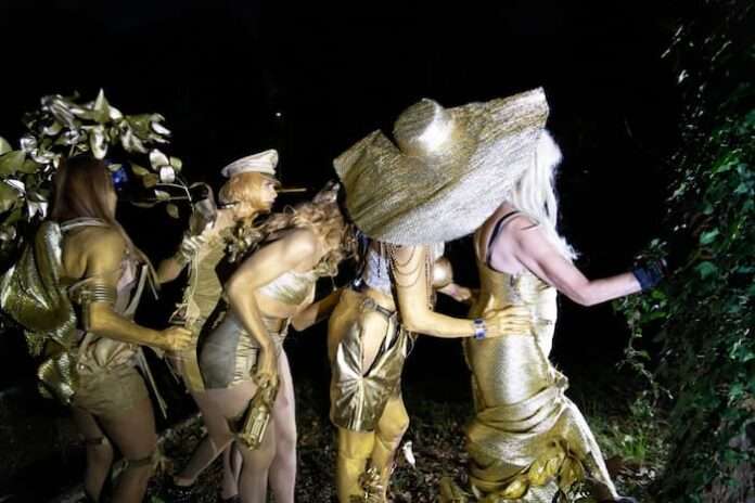 Entre cirque et cabaret, fête foraine, parade, rituels collectifs… des univers se télescopent toujours autour de l’indéterminé et de l’exutoire. Il faut pénétrer dans une grande architecture façon carton-pâte en tissu Fat to Ashes imaginé pour le Hamburger Bahnhof, découvrir différents vêtements dorés d’une femme qui rentre de soirée, croiser des excroissances sur le sol… un peu comme dans Alice au Pays des Merveilles. Tout est disproportionné, comme ce jardin de roses « Hot Flashes Flowers ».