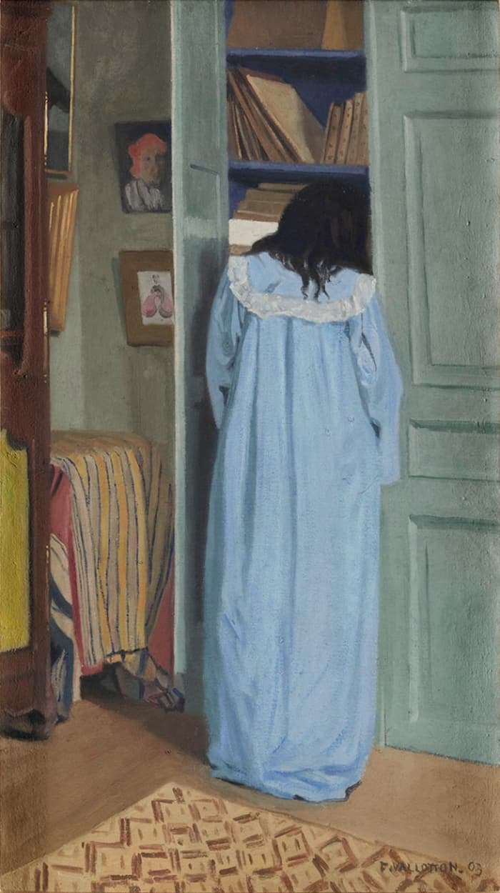Georges Banu dans son remarquable ouvrage L’homme de dos parle de figures de renoncement et son intuition qui rejoint de nombreuses thématiques du parcours s’applique parfaitement ici. Ce personnage transforme notre regard tout en déjouant nos attentes. Il est tourné vers un ailleurs qui nous reste inaccessible. Dans la lignée de la peinture romantique allemande du XIXème siècle « les figures de dos » deviennent le support d’une expérience à la fois visuelle et philosophique dont le grand représentant est Caspar David Friedrich, absent du parcours bien que suggéré par la photographe Elina Brotherus qui donne sa réponse au célèbre « Voyageur contemplant une mer de nuages ». Le personnage placé au premier plan, dans un paysage ou un intérieur du quotidien invite le regardeur à entrer pleinement dans la scène. Il s’agit autant d’un dispositif de narration que de perception. Felix Valloton, adepte de l’énigme qui cache une relative menace avec « Intérieur, femme en bleu fouillant dans une armoire » laisse planer le doute sur une scène en apparence banale.